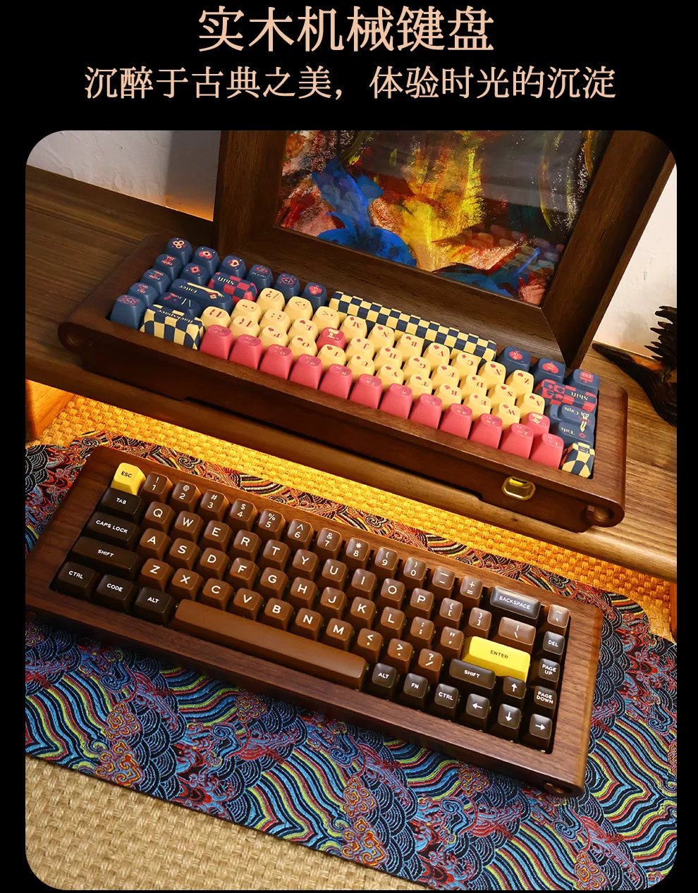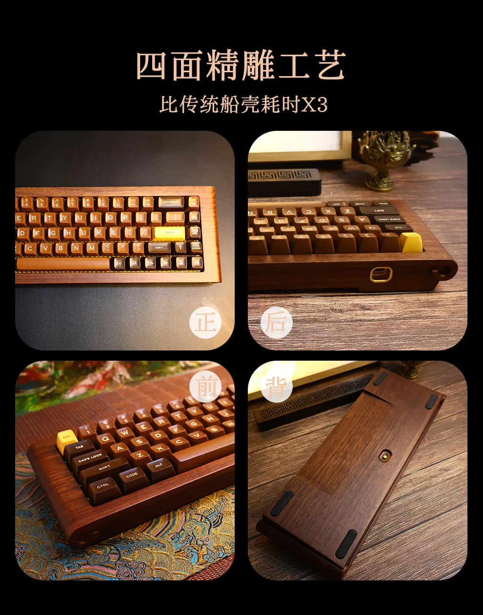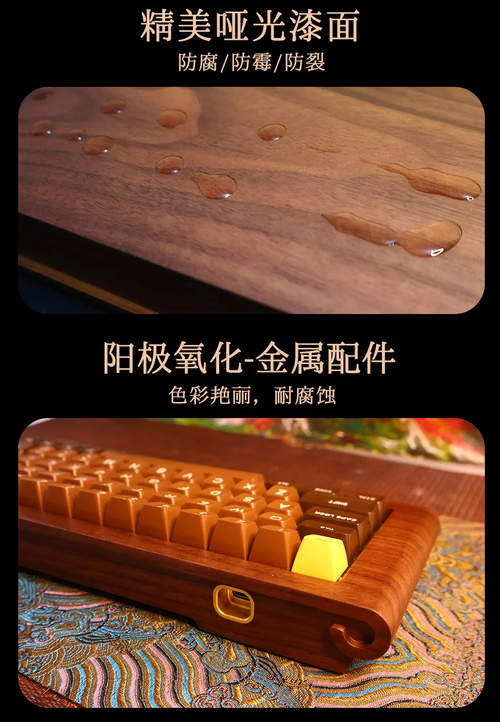 2.Solid wood mechanical keyboard, selected high-quality walnut, CNC one-piece molding shell, using the Chinese ancient ship shape design, the appearance of matte paint, wear-resistant and corrosion-resistant.
