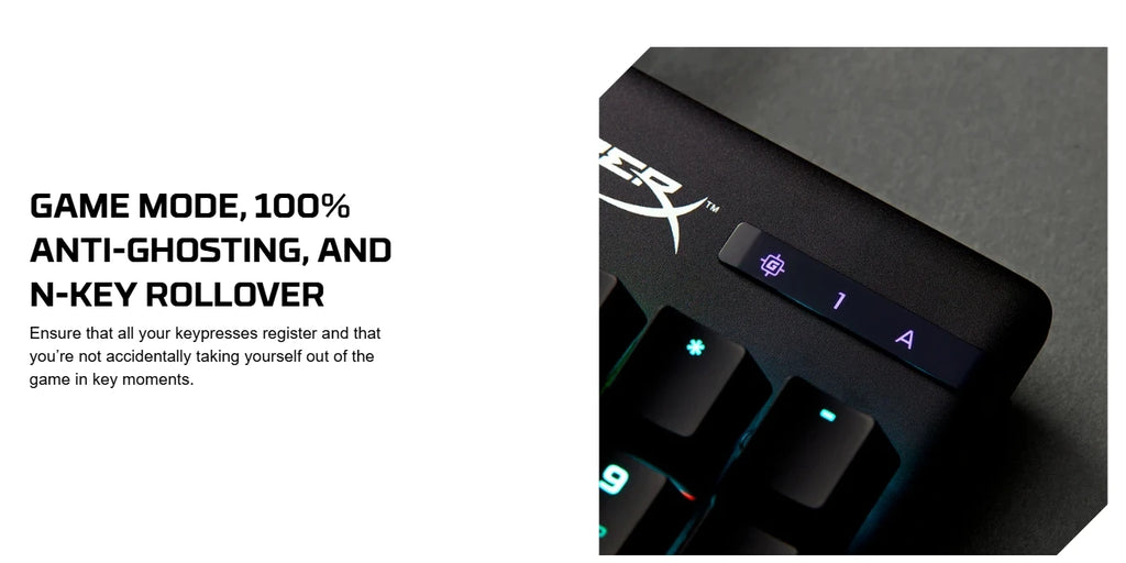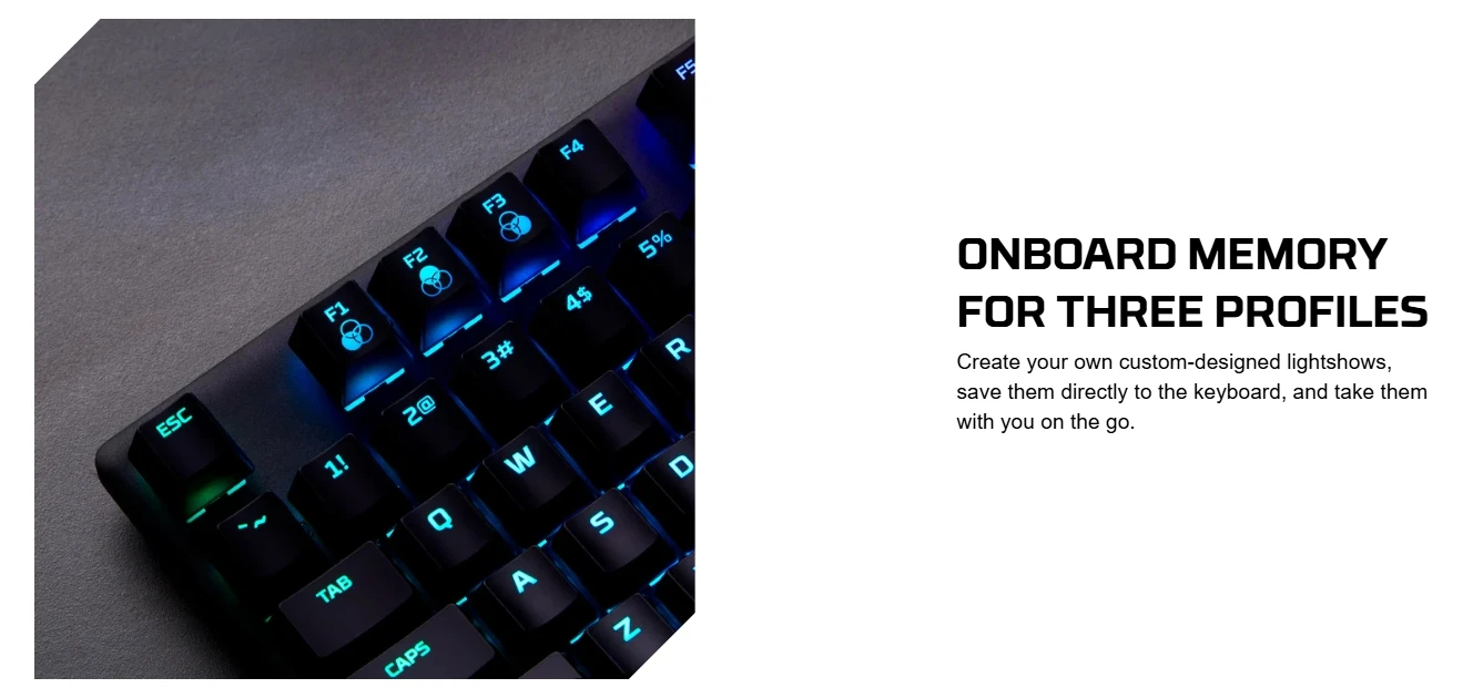 * Actuation Point: Mechanical * Backlight: RGB (16,777,216 colors) * Light Effects: Per key RGB lighting and 5 brightness levels * Onboard Memory: 3 profiles * Anti-ghosting: 100% anti-ghosting * Rollover: N-key * Acceleration: Yes * Game Mode: Yes * OS Compatibility: Windows® 10, 8.1, 8, 7 |
